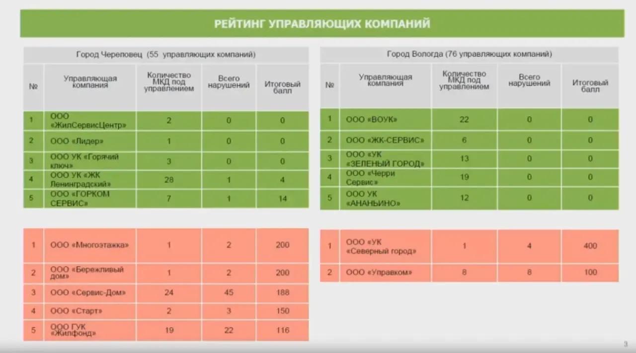 В рейтинге управляющих компаний Вологды и Череповца лидируют: