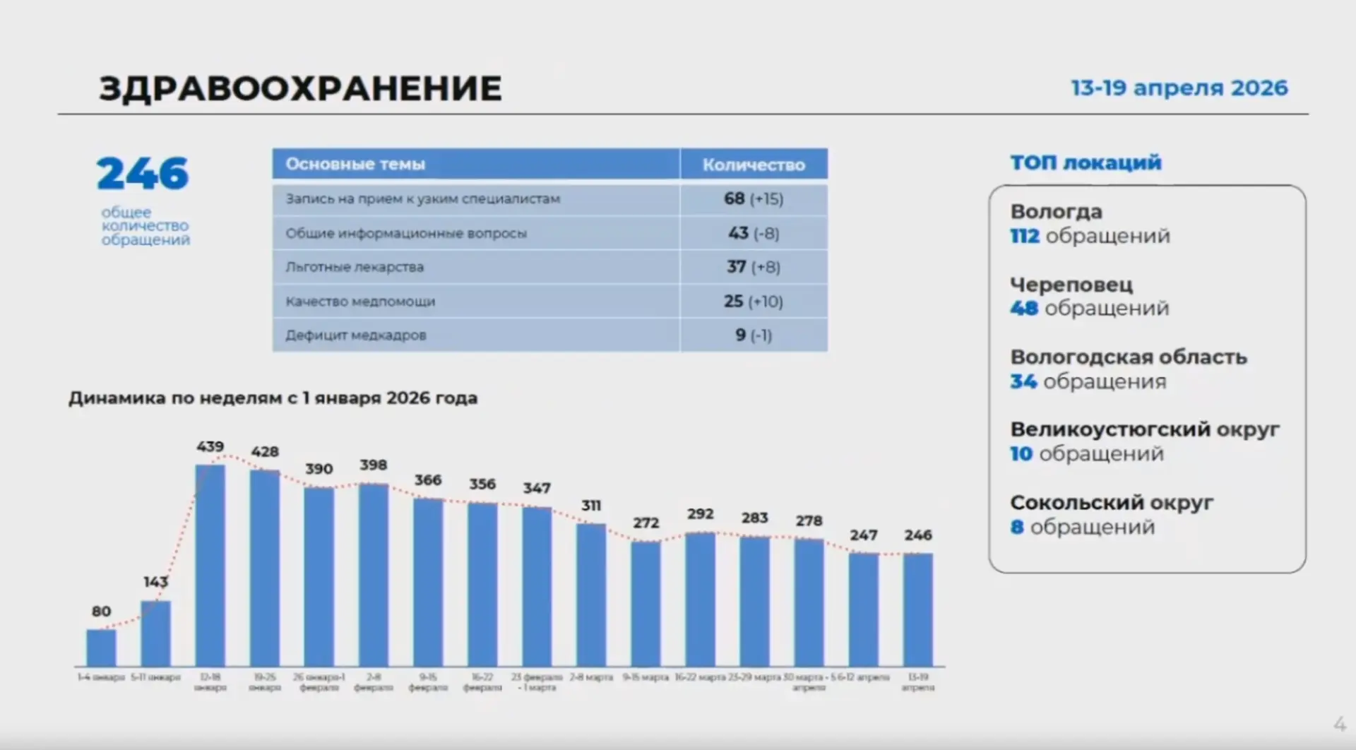 Общее количество обращений составило 246, из которых основными темами стали:Запись на прием к узким специалистам (68).Общие...