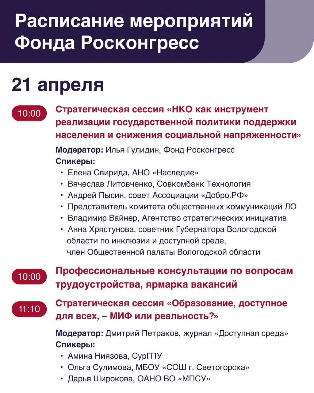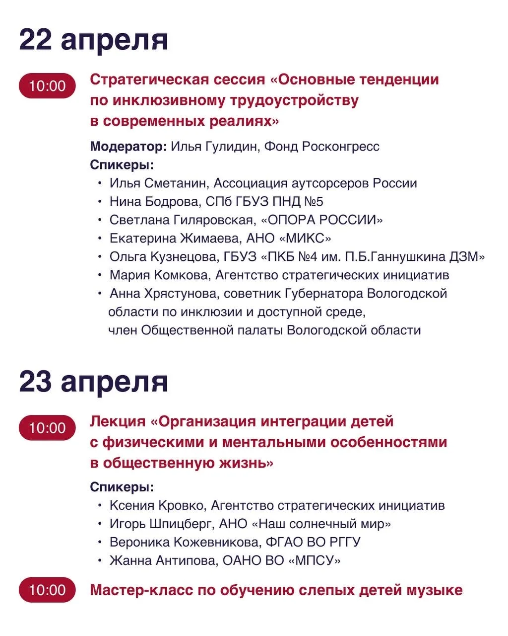 - Стратегическая сессия «Основные тенденции по инклюзивному трудоустройству в современных реалиях». https://vk.ru/wall-219690605_311