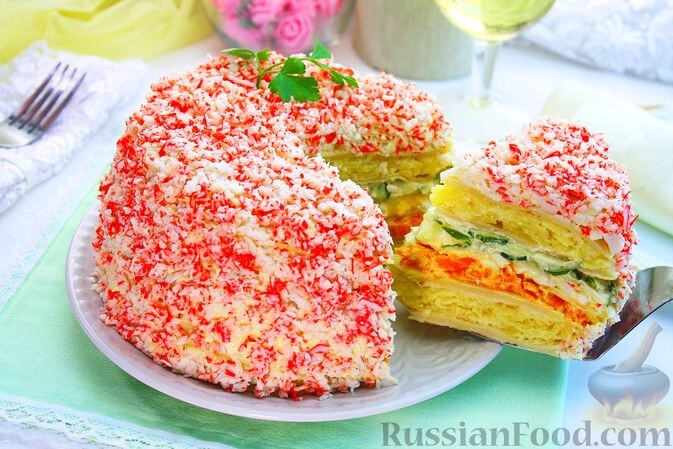 - Блинный торт с крабовыми палочками – это не просто закуска, а настоящее произведение искусства! Пышные блинчики прослаиваются начинкой из варёных овощей и крабовых палочек, образуя многослойный торт, который станет центром внимания на любом столе.